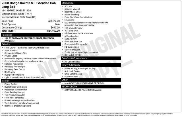 Whether you're tackling a job site, navigating the great outdoors, or simply running errands around town, the 2008 Dodge Dakota ST is the perfect companion. With its impressive fuel efficiency of 16 city/20 highway MPG, this truck won't break the bank at the pump, making it a smart choice for the savvy shopper.