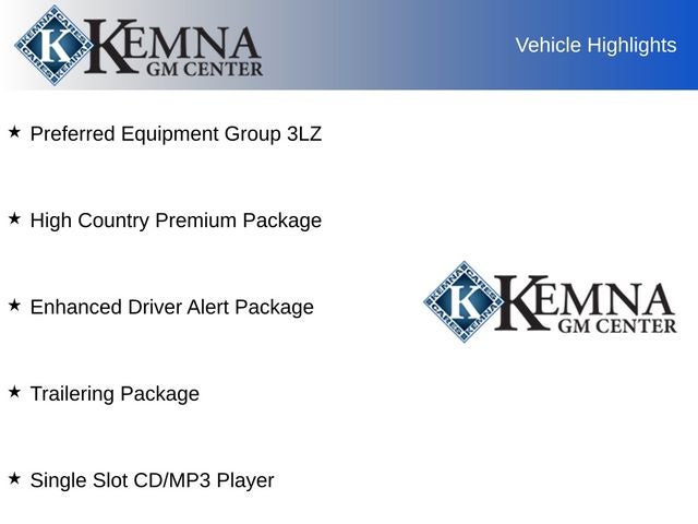 - High Country includes High Country brushed metal sill plate, (AN3) front full-feature leather-appointed bucket seats, (KB6) heated and vented seats, (K4C) Wireless Charging, (B58) color-keyed carpeted floor mats, (D07) center floor console, (UQA) Bose sound system, (NZJ) 20" chrome wheels, (IO6) MyLink 8" Diagonal Color Touch audio system with Navigation, (QSS) P275/55R20 all-season, blackwall tires, (UD5) Front and Rear Park Assist, (VB5) body-color front bumper, (VT5) body-color rear bumper, unique chrome grille, (V76) Black recovery hooks, (VQZ) polished exhaust tip, LPO, (CTD) cargo tie downs, dealer-installed (4) and (BVQ) chrome assist steps