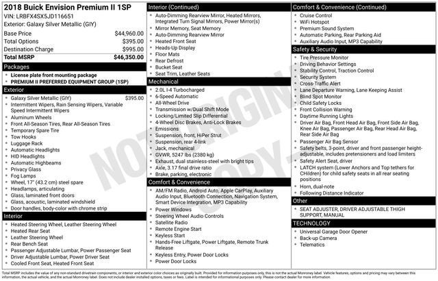 Discover the perfect blend of style, performance, and technology in this stunning 2018 Buick Envision Premium II. With its sleek Silver exterior and a host of premium features, this Envision is ready to elevate your driving experience.• LOCAL TRADE• Galaxy Silver Metallic• Preferred Equipment Group 1SPIndulge in the exceptional comfort and convenience of this Envision, featuring:• Heads-Up Display• Power driver seat• Power Liftgate• Auto High-beam Headlights• Heated steering wheel• Heated and ventilated front seats• Heated rear seatsStep inside and be captivated by the Buick Infotainment System, complete with navigation, a premium Bose sound system, and seamless smartphone integration through Apple CarPlay and Android Auto. Stay connected and entertained on every journey.Beneath the sleek exterior lies the powerful 2.0L 4-cylinder turbocharged engine, delivering an impressive 20 city/26 highway MPG. The all-wheel-drive system ensures confident handling in a variety of road conditions, while the 6-speed automatic transmission provides smooth and responsive power delivery.Safety is paramount in the Envision, with features like forward collision alert, lane keep assist, and a surround-view camera system to help you navigate with confidence. The comprehensive suite of airbags and advanced stability control systems provide added peace of mind.Discover the exceptional value and premium experience of this 2018 Buick Envision Premium II. Schedule a test drive today and experience the difference for yourself. We're confident you'll be impressed by the Envision's exceptional blend of style, technology, and performance.