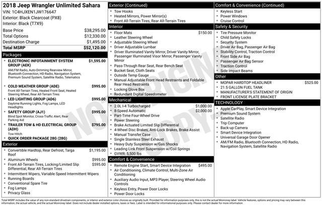 This 2018 Jeep Wrangler Unlimited Sahara is equipped with an impressive array of features that make it the perfect companion for your adventures. From its sleek black exterior to its powerful 2.0L I4 DOHC engine with 8-speed automatic transmission and 4WD, this Wrangler is ready to take on any terrain.