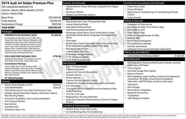 Elevate your driving experience with this exceptional 2019 Audi A4 2.0T Premium Plus quattro. This meticulously maintained luxury sedan offers a captivating blend of performance, technology, and refined style that will elevate your daily commute.- LOCAL TRADE**- ONE OWNER**- Glacier White Metallic exterior- COLD WEATHER PACKAGE- PREMIUM PLUS PACKAGE- Audi smartphone interface (Apple CarPlay/Android Auto)- Genuine wood interior accents- Heated front seatsPowered by Audi's renowned 2.0L TFSI engine and quattro all-wheel drive system, this A4 delivers a thrilling and confident driving experience. The 7-speed S tronic automatic transmission seamlessly transfers the engine's robust 248 horsepower, providing exceptional acceleration and responsive handling. With an EPA-estimated 34 mpg highway, this Audi strikes an impressive balance between performance and efficiency.The Premium Plus trim elevates the A4's already impressive capabilities, adding a wealth of premium features. The Audi Virtual Cockpit digital instrument cluster and MMI Navigation Plus system with an 8.3-inch center display keep you connected and informed, while the Audi Side Assist with Rear Cross Traffic Assist enhances your awareness on the road. The Audi Advanced Key system and power-folding mirrors add convenience, while the Audi Pre Sense Rear system provides an extra layer of safety.Step inside the A4's cabin and you'll be greeted by an impeccably crafted environment. Supple leather seating surfaces, genuine wood accents, and a premium Audi Sound System create an exceptional sensory experience. The heated front seats and steering wheel, along with the dual-zone automatic climate control, ensure year-round comfort.This one-owner Audi A4 has been meticulously maintained and is ready to deliver an unparalleled driving experience. With its blend of performance, technology, and luxury, this exceptional sedan is the perfect choice for the discerning driver. Schedule a test drive today and discover the true joy of the open road.