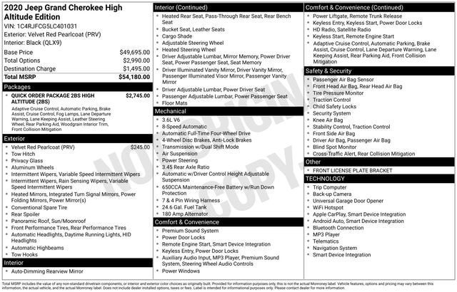 KEMNA CERTIFIED ADVATAGE INCLUDES* 1 Year EG Repel Paint Protector* 1 Year EG Repel Interior Protector* 1 Year Collision Deductable* 1 Year Key Fob Replacement*6 Month/ 6,000 Mile Premier Limited Warranty* 6 Month/ 6,000 Mile Limited Warranty* Compimentary Rental Vehicles* 6 Months Free Car Wash* 15% OFF Auto Spa purchase* 10% OFF all accessoriesElevate your driving experience with this stunning 2020 Jeep Grand Cherokee High Altitude. This meticulously maintained SUV boasts a striking Red exterior and a host of premium features that will captivate the senses. With just 92,105 miles on the odometer, this Jeep is ready to take you on countless adventures.- CARBRAVO CERTIFIED- LOCAL TRADE IN- FULLY SERVICED AND DETAILED- OIL AND FILTER CHANGE- Quick Order Package 2BS High Altitude- Trailer Tow Group IV- Advanced Brake Assist- Adaptive Cruise Control w/Stop- Heavy-Duty Engine Cooling- Black Roof Molding- Body Color Door Handles- Body Color Exterior Mirrors- Body Color Fascias w/Granite Accents- Body Color Sill Extension- Dark Day Light Opening Moldings- Dark Headlamp Bezel Finish- Dark Lens Taillamps- Dual Dark Chrome Exhaust Tip- Granite Crystal Exterior Accents- Granite Crystal Exterior Badging- Granite Crystal/Black Grille- Premium Accent Claddings- Premium LED Fog Lamps- Anodized/Light Black Chrome Interior Accents- Black Wood Instrument Panel & Door Spears- Bright Pedals- Full Speed FWD Collision Warn Plus- Lane Departure Warning Plus- Leather Wrapped Steering Wheel- Nappa Leather Trimmed Bucket Seats- Parallel & Perp Park Assist w/Stop- 7 & 4 Pin Wiring Harness- Class IV Receiver Hitch- Wheels: 20 x 8.0 Low Gloss Granite Crystal- Rain Sensitive Windshield WipersBeneath the striking exterior lies a powerful 3.6L V6 24V VVT engine, mated to an 8-Speed Automatic transmission, delivering a smooth and responsive driving experience. With an impressive 18 city / 25 highway MPG, this Jeep Grand Cherokee offers exceptional fuel efficiency without compromising capability.The High Altitude trim level elevates the Grand Cherokee's premium features, including a panoramic sunroof, advanced safety technologies, and a state-of-the-art infotainment system. Indulge in the luxurious Nappa leather-trimmed seats, enjoy the convenience of the power liftgate, and stay connected with the seamless integration of Apple CarPlay and Android Auto.This Jeep Grand Cherokee High Altitude is a true testament to Jeep's commitment to craftsmanship and innovation. With its impressive capabilities, refined interior, and head-turning style, it's the perfect companion for your next adventure. Experience the difference for yourself by scheduling a test drive today. We're confident you'll be impressed by the exceptional value and uncompromising quality of this remarkable SUV.
