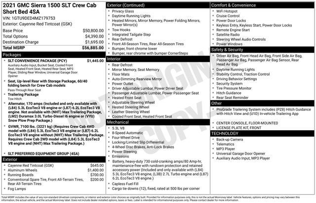 KEMNA CERTIFIED ADVATAGE INCLUDES* 1 Year EG Repel Paint Protector* 1 Year EG Repel Interior Protector* 1 Year Collision Deductable* 1 Year Key Fob Replacement*6 Month/ 6,000 Mile Premier Limited Warranty* 6 Month/ 6,000 Mile Limited Warranty* Compimentary Rental Vehicles* 6 Months Free Car Wash* 15% OFF Auto Spa purchase* 10% OFF all accessoriesThis 2021 GMC Sierra 1500 SLT is packed with impressive features that will elevate your driving experience. Key highlights include:• Super low mileage• Fully serviced and detailed• New cabin air filter• Oil and filter change• SLT Convenience Package• Trailering Package• Heated and ventilated front seats• Heated rear seats• 20 polished aluminum wheels• Rear sliding power window• Universal home remote• Rear heated seats• Integrated trailer brake controller• In-vehicle trailering appVehicle DetailedThis Sierra 1500 SLT is CARBRAVO CERTIFIED, meaning it has undergone a thorough inspection and reconditioning process to ensure it meets our high standards. You can trust that this truck is in exceptional condition and ready to provide you with years of reliable performance.As a CARBRAVO CERTIFIED vehicle, this Sierra 1500 SLT comes with a comprehensive warranty and additional benefits that provide you with peace of mind. You'll enjoy the confidence of knowing that your investment is protected, and you'll have the support you need to keep your truck running at its best.With its powerful EcoTec3 5.3L V8 engine, 4-wheel drive capabilities, and impressive towing capacity, this Sierra 1500 SLT is the perfect companion for your adventures, whether you're hauling a trailer, navigating rough terrain, or simply enjoying the open road. The spacious interior and premium features, such as the heated and ventilated front seats and the rear sliding power window, ensure that you and your passengers will travel in comfort and style.Imagine the possibilities with this exceptional 2021 GMC Sierra 1500 SLT. Experience the power, capability, and refinement that make this truck a true standout in its class. We invite you to schedule a test drive and see for yourself why this Sierra 1500 SLT is the perfect choice for your next vehicle.