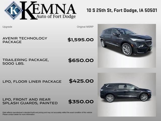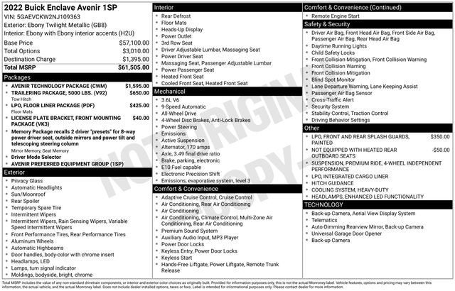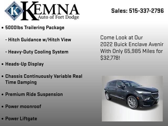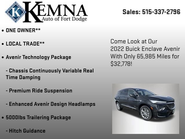 Introducing the 2022 Buick Enclave Avenir - a captivating SUV that blends sophistication, capability, and cutting-edge technology. This stunning Black beauty boasts a powerful 3.6L V6 engine, mated to a responsive 9-Speed Automatic transmission and Intelligent All-Wheel Drive, delivering an exceptional driving experience with an EPA-estimated 25 MPG highway.- ONE OWNER**- LOCAL TRADE**- AVENIR TECHNOLOGY PACKAGE- TRAILERING PACKAGE, 5000 LBS.- FLOOR LINER PACKAGE (LPO)- FRONT AND REAR SPLASH GUARDS, PAINTED (LPO)- Heads-Up Display- Chassis Continuously Variable Real Time Damping- Premium Ride Suspension- Power moonroof- Power Liftgate- Front & Rear Park Assist- Auto High-beam Headlights- Heavy-Duty Cooling System- Enhanced Avenir Design HeadlampsElevate your driving experience with the Enclave Avenir's impressive array of premium features. Sink into the plush, perforated leather-appointed seats and enjoy the comfort of heated and ventilated front seats, as well as heated second-row outboard seats. The Bose Performance-Enhanced 10-Speaker System and Buick Infotainment System with Wireless Apple CarPlay and Android Auto integration will keep you entertained and connected on every journey.Designed with your safety in mind, the Enclave Avenir offers a comprehensive suite of advanced driver-assistance technologies, including Forward Collision Alert, Automatic Emergency Braking, Lane Keep Assist with Lane Departure Warning, and Rear Cross-Traffic Alert. Experience the confidence of a vehicle that truly has your back.Whether you're embarking on a family road trip or tackling your daily commute, the 2022 Buick Enclave Avenir is the perfect companion. With its impressive 5,000-lb towing capacity, you can bring along your favorite toys or gear with ease. And with the available Hitch Guidance and Hitch View features, maneuvering with a trailer has never been simpler.Discover the perfect blend of style, comfort, and capability in the 2022 Buick Enclave Avenir. Visit our showroom today and let us demonstrate how this exceptional SUV can enhance your driving experience. We're confident you'll be impressed by its uncompromising quality and attention to detail. Take the next step towards owning a vehicle that will elevate your everyday adventures.