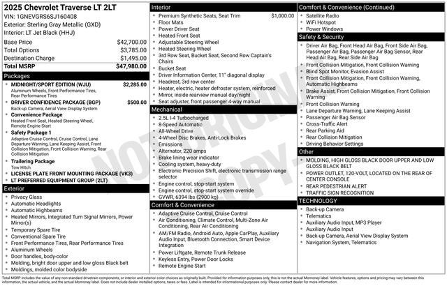 Powered by a robust 2.5L DOHC engine and equipped with an 8-speed automatic transmission and all-wheel drive, the 2025 Traverse LT 2LT delivers a dynamic and confident driving experience. With an impressive fuel efficiency of 19 MPG in the city and 24 MPG on the highway, this SUV offers a harmonious balance of power and efficiency.